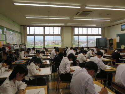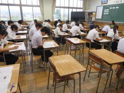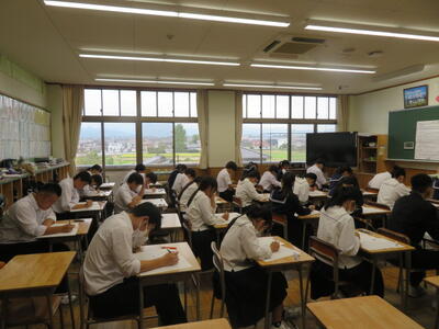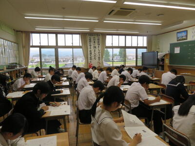 今日は、3年生が到達確認テスト(40点満点テスト)を行っています。今まで勉強してきた成果が発揮できるといいですね。どのクラスも集中して取り組んでいました。