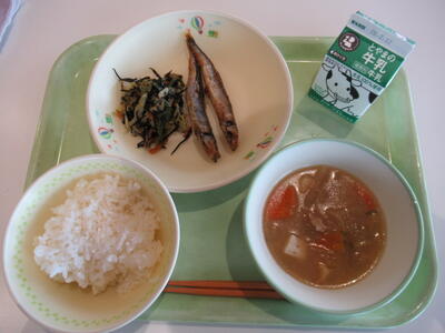 本日のメニューは、牛乳、ごはん、豚汁、揚げししゃも、ひじき炒めです。