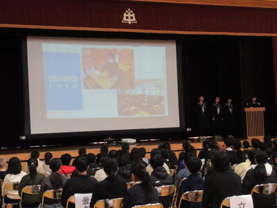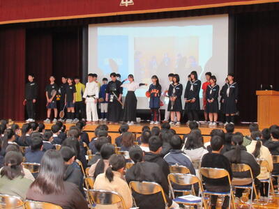 生徒会からは、雄山中学校での一日の過ごし方や行事等がスライドショーなどを使って紹介されました。