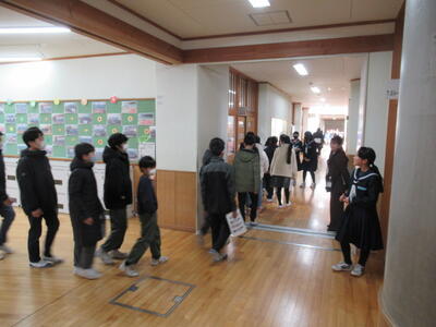 また、各部活動からは生徒達がユニフォームを実際に来て、どんな部活動があるか紹介されました。その後、2年生の代表生徒が先導し、小学6年生と一緒に校舎見学をしました。先導する2年生は、何度も振り返り「大丈夫?」など声をかけていました。