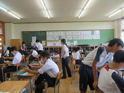 暑いさなかですが、10月末に実施される合唱コンクールの曲を決めています。今日は3年生がクラスで歌う合唱曲を考えました。
