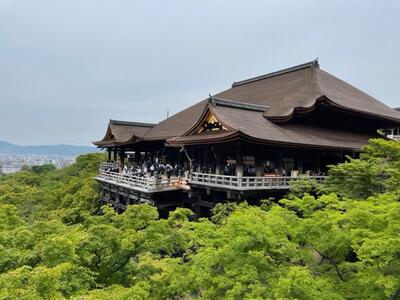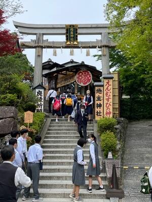 班別学習で京都を回っています。清水寺では歴史を学び、お土産やおみくじを楽しみ、班で協力していますね。