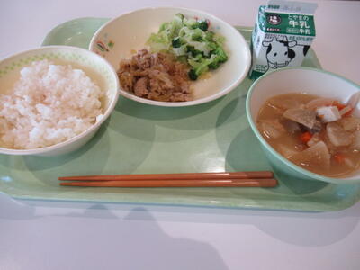 本日のメニューは、牛乳、ごはん、ごまけんちん、豚肉の生姜炒め、ゆで野菜です。