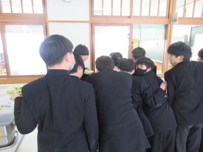 今日のメニューである、豚肉の生姜炒めをめぐって、おかわりをしたい生徒が食缶に群がっています。