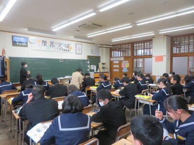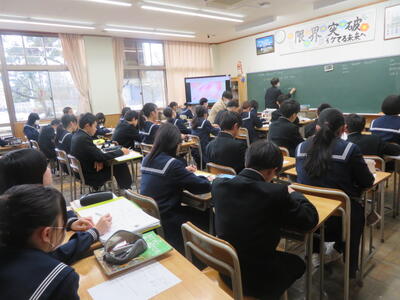 「過去の否定文」について学習をしていました。ペアになり、まとめのワークシートに取り組んでいたようです。過去の否定文を理解する為に、既習した内容について先生から色々な質問がありましたが、生徒たちはテンポよく答えていました。ペアになると、お互いに答えを確認しながら、自信をもって答えることができているようです。