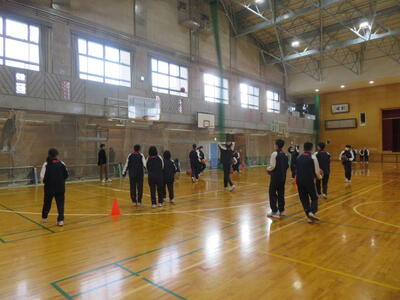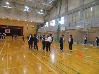 バスケットボールをしていました。取材した時は、3ポイントシュートの練習をしていました。ゴールまで距離があり、なかなか難しいですが、何度もボールを投げ、あきらめずに頑張る姿がみられました。体育の先生は、バスケ部の顧問の先生なので、的確なアドバイスがもらえたと思います!