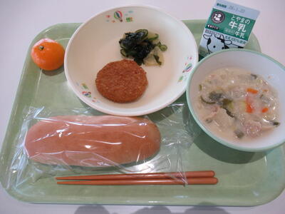 本日のメニューは、牛乳、コッペパン、白ねぎのクリームシチュー、メンチカツ、海藻サラダ、みかんです。