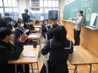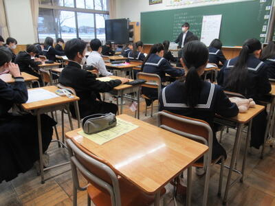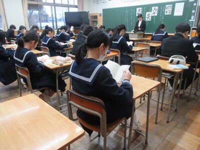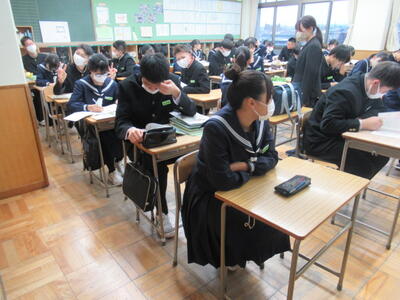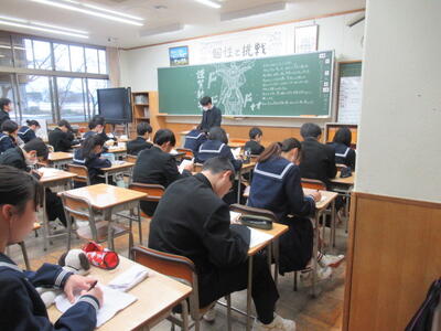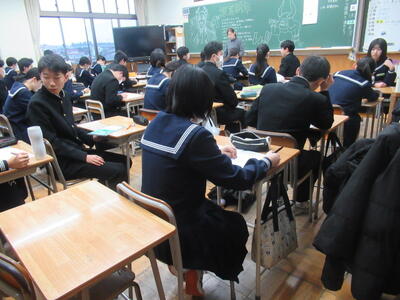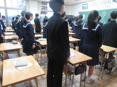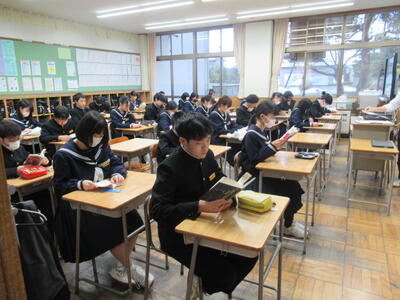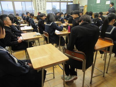 3限目は、各学年で学年集会が行われていました。学年の先生達から2学期を振り返ってのねぎらいや、3学期に向けて頑張ってほしいこと等について話がありました。また、学級の代表が2学期を振り返り、学級のよかったことや改善点について発表する学年もありました。一番長い学期でしたが、どの生徒も様々な活動を通して成長できた学期だったのではないでしょうか。次のステージに向けて、3学期はさらにパワーアップできる学期になればと思います。