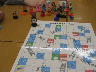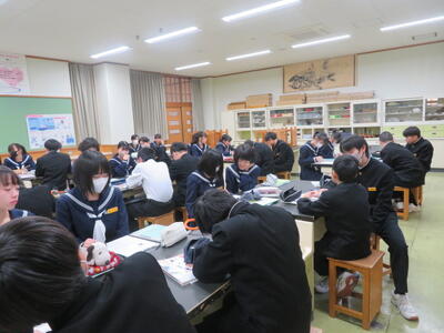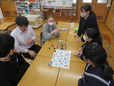 英語ですごろくをしていました。すごろくのコマは、生徒達が楽しめるように色々なアニメのキャラクターになっていました。ALTの先生は、生徒達が楽しみながら英語を勉強できるように、教材・教具にたくさんの工夫をされています。コマを選ぶだけでも生徒達は、盛り上がっていました。