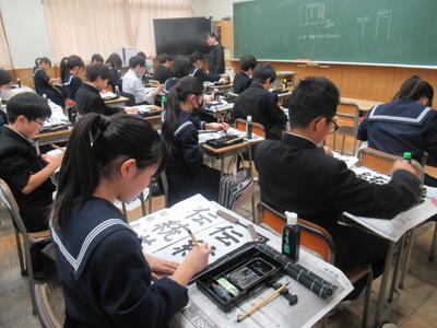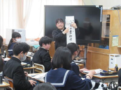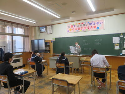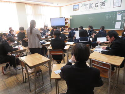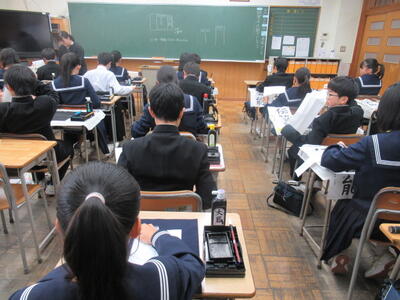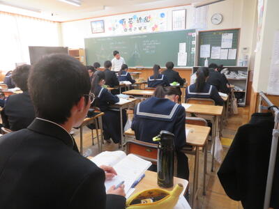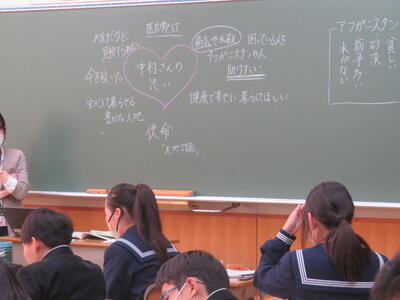 「真珠の水ー中村哲ー」という教材を学んでいました。アフガニスタンで活躍された中村さんの想いをクラス全体で考えていました。黒板には、生徒が話した意見がまとめてありました。教材を読んで感じたことを、一人ひとりが自分の言葉で伝え、それをクラス全体で共有することで、考えを深めている様子でした。先生からは「友達と似たような意見でも、まずは自分の言葉で表現してみよう」という声掛けもあり、一人ひとり率直に発表していました。