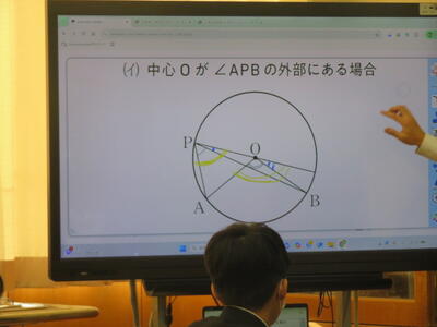 円周角の定理について勉強をしていました。先生は、黒板や電子黒板を使い、分かりやすく説明をしていました。数学にはサポーターの先生もいて、質問がある生徒のサポートや、問題に悩んでいる生徒に個別に声を掛けていました。分からないことがあっても、すぐ質問をすることができると安心ですね。