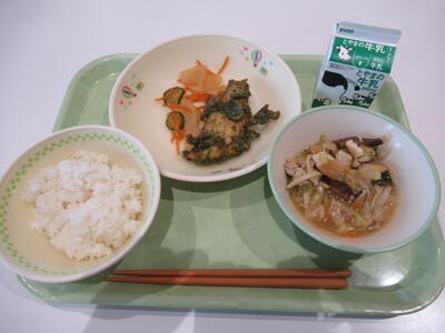 本日のメニューは、牛乳、ごはん、白菜鍋、華風和え、魚の磯部揚げです。