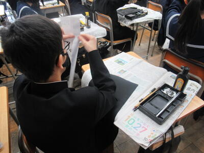 「鏡で反射する光の屈折」という課題について学習をしていました。班になり、ワークシートの問題に取り組んでいました。お互いに教え合い、理解を深めていたようです。難しいと感じた生徒には、先生が一緒に問題をやってみているようです。お互いに教え合うことで、理解がさらに深まりますね。
