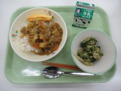 本日のメニューは、牛乳、発芽玄米ごはん、冬野菜カレー、オムレツ、ブロッコリーのごまだれです。