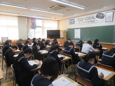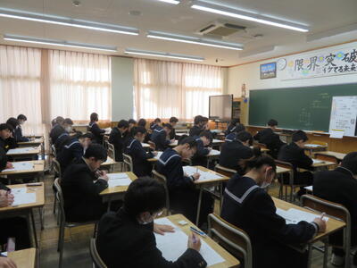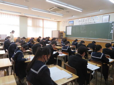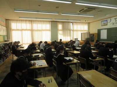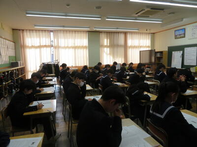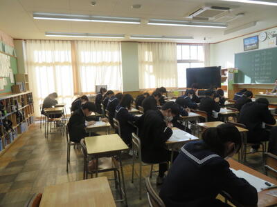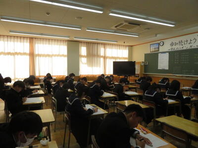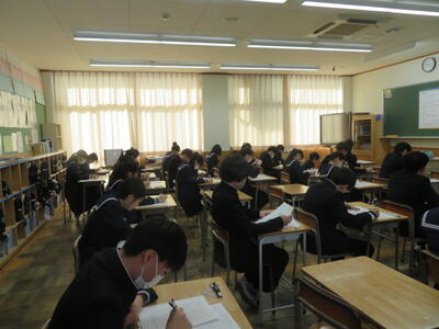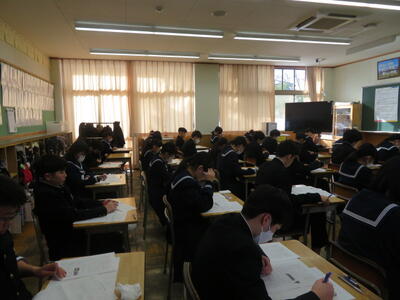 受験対策プリントに取り組んでいました。2月に入り、どの教科も総復習の内容です。何度も何度もテスト問題に挑戦することで受験当日でもしっかりとした心構えでテストを受けることができると思います。3年生の集中力は、ずっと継続してきた努力の証です。頑張る3年生の姿に、こちらも励まされるような気持ちになりました。3年生、とてもよく頑張っています!