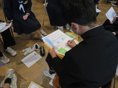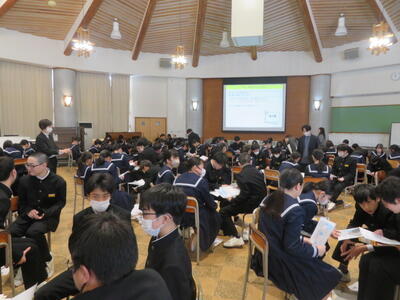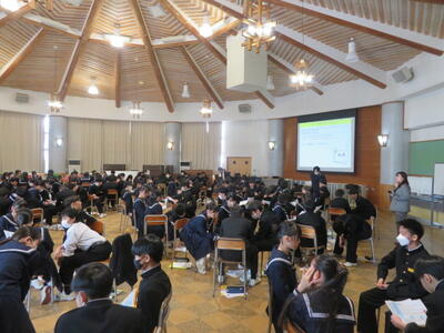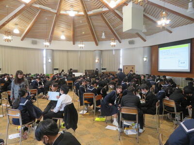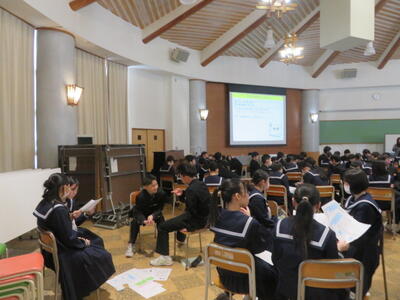 1年生は、総合の時間で「キャリア教育」に関する活動をしていました。東京から講師の先生をお招きしました。生徒達は”キャリアカウンセラー”になって、顧客の情報を聞き取り、顧客に合った求人を紹介するという活動を行っていました。生徒達は、たくさんの求人から顧客の要望に合う仕事を議論しながら選んでいました。その過程で、それぞれの仕事に必要なスキルや、顧客の要望に合うよう様々な仕事の細かい情報を分析していたようです。初めての活動になりますが、活発に意見を出し合い、様々な仕事の詳細について学んでいるようです。
