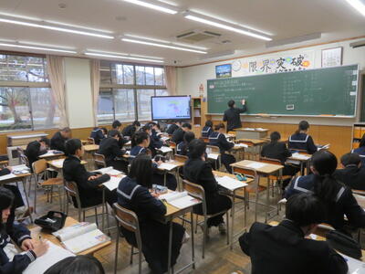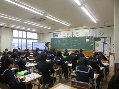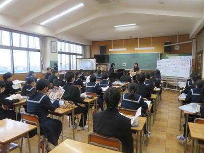 ギターの使い方について先生が説明をしていました。ギターのコード表を見ながら、どの弦を押さえると、どのような音が出るのか先生が実演をしていました。ギターのきれいな音色が音楽室に響いていて、この後は、生徒達が実際にギターを使って音を出してみるようです。音楽の時間を通して、様々な楽器に慣れ親しむことができますね。