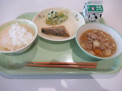 本日のメニューは、牛乳、ごはん、肉じゃが、さわらの西京焼き、たくあん和えです。