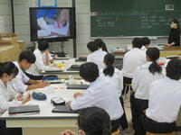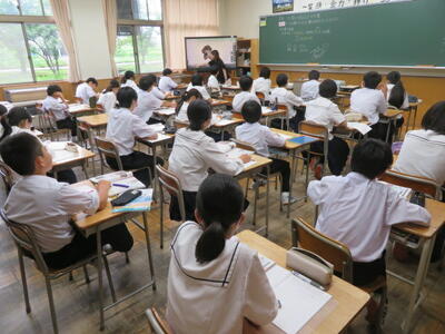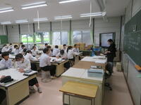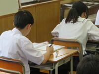3年2組は家庭科の授業でした。3年生は幼児に関する内容を学習しているところですが、今日の授業では、幼児が生活習慣を習得する中での大人の役割について考えました。授業の途中には3歳児がひとりで着替えをするビデオを見ましたが、思春期真っ只中の中3生であっても、温かい目をして見たのが印象的でした。