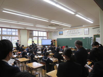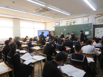 雄山中学校では、普段の授業でも「読み解く力」の視点が取り入れられています。本日は、教育の科学研究所の新井先生をお招きし、「RSノート」活動の様子や3つの授業を参観して頂きました。新井先生からは、RSの活動に一生懸命取り組む生徒の姿勢に対して温かいおほめの言葉を頂きました。また、午後からの研究会では、今後の授業に活かせる助言をたくさん頂きました。