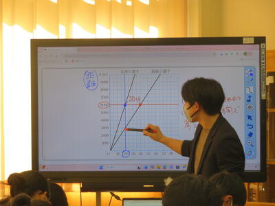 「比例や反比例のグラフを利用して、問題を解こう!」という課題に取り組んでいました。先生とやりとりをしながら、テンポよく授業が進められていました。また、先生は、電子黒板を活用し、わかりやすく説明していました。雄山中学校では、全ての教室に電子黒板があります。先生と一緒に教科書をみながら授業をしている感覚で、教科書のどの部分の説明かが一目で分かりますね。