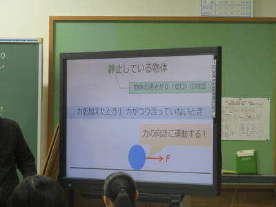 「物体に力がはたらかない時や、力がつりあっている時、物体はどのようなはたらきをするだろうか?」という課題を学習していました。静止した状態でも、物体は0の運動をしているという説明を聞き、生徒達は驚いていました。生徒からは「じゃあ、ぬいぐるみも『0』の運動してるってことですか?」と質問があり、先生は「その通り!」と答えておられました。先生のオリジナルの資料を見ながら、理解を深めていました。