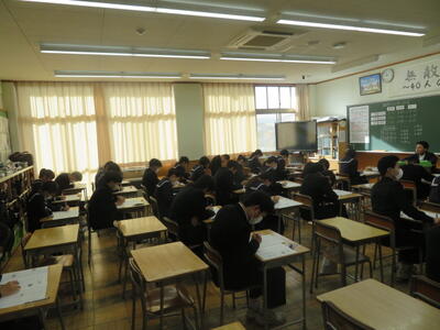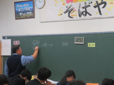 訪れた時は、反比例の式をグラフで表す学習を終えて、先週行われた中教研学力調査の答案返却と解説を先生がしておられました。1年生はテストの答え方で、まだまだ「伸びしろ」があると思います。テストを受けるたびに1つずつ積み上げていきましょう、失敗しながら。