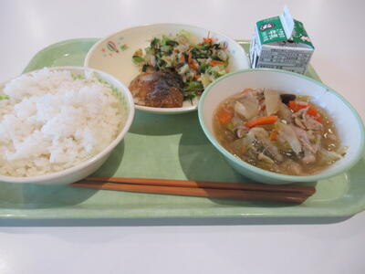 本日のメニューは、 ごはん、白菜鍋、さばの味噌煮、ごま和え、牛乳です。