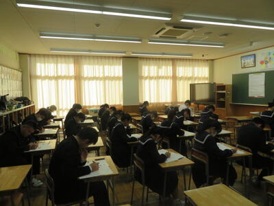 先日行われた中教研テストが返却されました。入試によく出るポイントについて先生から詳しい説明がありました。黒板には化学式が書かれていて、とても分かりやすかったです。真剣にテストの後の復習に取り組む姿は「さすが受験生!」という雰囲気でした。