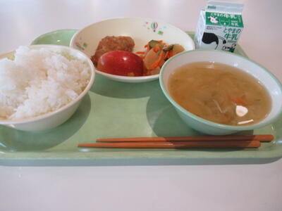 本日のメニューは、ごはん(新米給食)、牛乳、とんかつの甘辛煮、大根サラダ、リンゴ、みそ汁です。