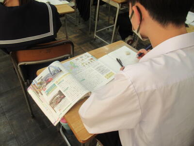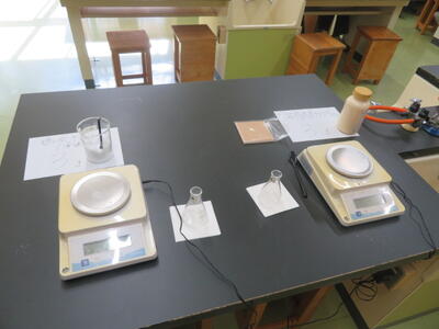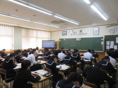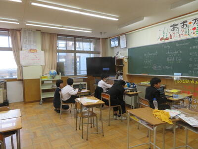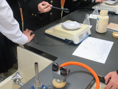 「百分率の求め方」という課題に取り組んでいました。実験で水溶液を作る際に必要な計算です。班になり、計算の仕方を互いに教え合っていました。実験に向けて、準備をしていくようです。