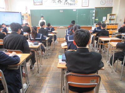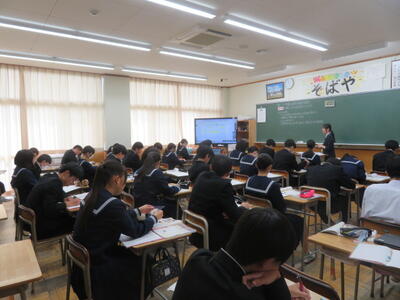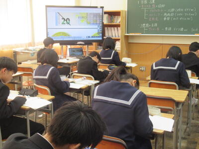 「性質を利用して角度を求めよう」という課題に取り組んでいました。代表生徒が先生からの問いかけに答えていました。全体で計算の仕方を確認した後、個々に練習問題に取り組むようです。