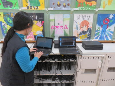雄山中学校には、ICT支援員さんがいます。パソコンやタブレットに関することを全てサポートして下さっています。今日は、タブレットに不具合がないか、1台1台確認する作業をされていました。みなさんの学習がスムーズに行えるように、定期的に確認作業をしてくださっています。生徒の皆さんと直接関わる機会は少ないかもしれませんが、裏方でみなさんの学習をいつも応援してくださっています。みんなで大切に使いましょう!