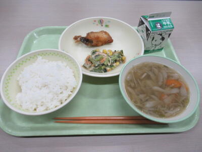 本日のメニューは、 ごはん、牛乳、カレイのから揚げ、カミカミサラダ、根菜スープ です。