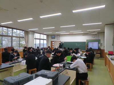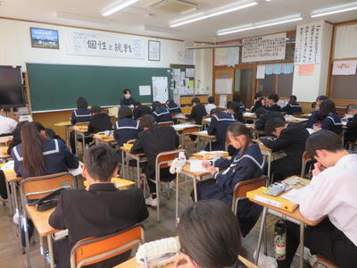 11月末にある期末考査に向けて、それぞれが自分のペースで勉強を進めていました。授業はどんどん進みますが、時折、時間をとって、今まで習った内容を振り返ることで、知識を整理したり、定着したりできるようにしています。集中した雰囲気の中で取り組んでいました。