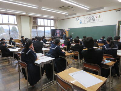 各クラスでの総合の発表を経て、クラス代表が選ばれ、今日はクラス代表が学年生徒全員の前で発表を行いました。発表資料はとても詳しかったです。発表後には、聞いていた生徒たちから質問や感想を伝える場面もありました。生徒達が調べた内容テーマには、「ジェンダー平等を実現しよう」「つくる責任つかう責任」「気候変動に具体的な対策を」「貧困をなくそう」等があり、真剣に今の日本が抱える課題について、どのように解決していけばいいか考えたことが伝わってきました。