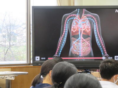「心臓のはたらきと血液の循環」という単元を学習していました。動脈・静脈がどのように流れ、身体を循環しているかを動画で観ることができたので、とても分かりやすかったようです。また、先生からは太い血管が身体のどこにあるかを教えてもらい、熱中症になった時はその部分を冷やすとよいことも知ることができました。知識を生活に結び付けることって大切ですね。