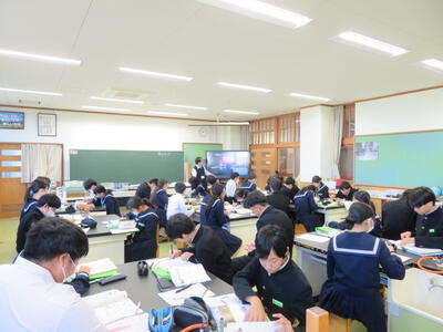 「1つの力を複数の力に分ける」という単元を学習していました。高校の物理の基礎となる内容です。電子黒板には傾斜上で物体に働く力がどのように変化するか動きをつけたパワーポイントのスライドでまとめられていて、難しい物理の内容でしたが、とても分かりやすく示されていました。このパワーポイントは、担当の先生のオリジナル教材だそうです!