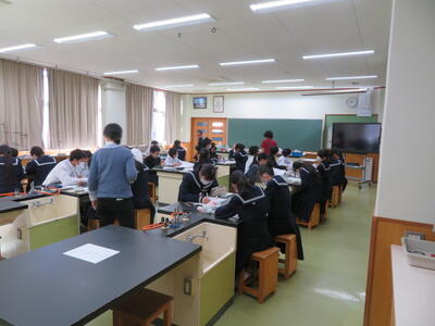 「質量パーセント濃度の求め方」についてプリント学習を行っていました。様々な水溶液を作る上で、必要な計算式に慣れていくための時間です。班で取り組めば難しい計算も教え合えたようです。また、理科の先生が2人で教えていたので、生徒達はたくさん質問をしていました。