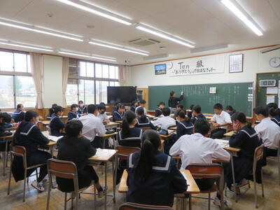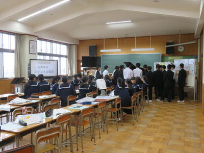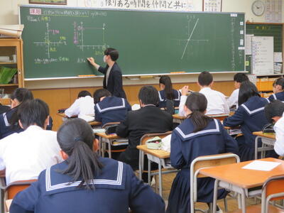 「比例のグラフの特徴を調べよう!」という課題に取り組んでいました。X軸、Y軸の読み取りかたを先生が説明して、生徒たちはノートにまとめていました。ノートを見せてもらったら、黒板と同じ色ペンで、とても分かりやすくまとめていました。後から見返した時も学習のポイントがすぐ見つけられそうです。落ち着いた雰囲気の中、授業が進んでいました。教室には合唱コンクールに向けた意気込みも掲示してあり、どちらも全力で取り組んでいる様子が見て取れました。