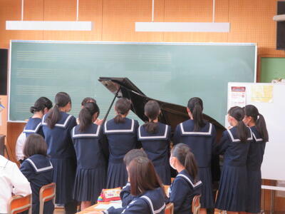 合唱コンクールに向けて練習をしていました。先生のピアノの周りにパート別に集まり、発声練習をしていました。先生のアドバイスに合わせて発声していくと、どんどん声が伸びていく様子が分かりました。発声練習で声を出す準備ができたら、いよいよ合唱です。本番当日もアドバイスに従い、まっすぐな声を体育館いっぱいに響かせてほしいです!
