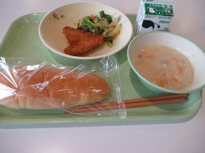 本日のメニューは、 コッペパン、牛乳、アジフライ、海藻サラダ、ホワイトシチュー です。