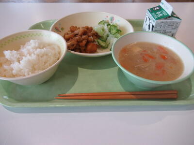 本日のメニューは、 ごはん、牛乳、鶏肉とひよこ豆の甘からめ、刻み和え、すりみ汁 です。