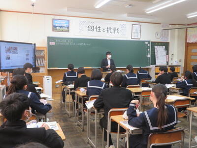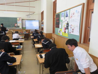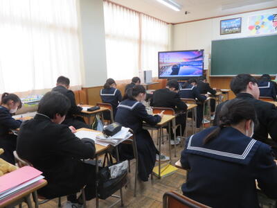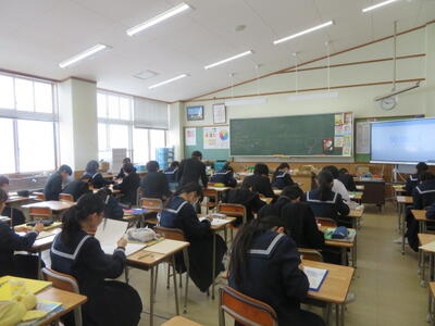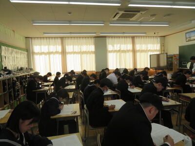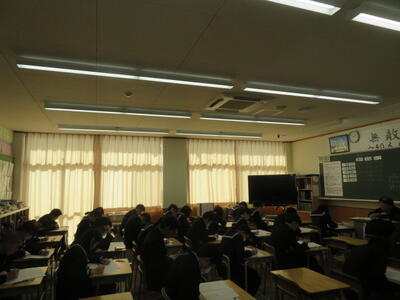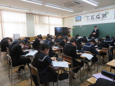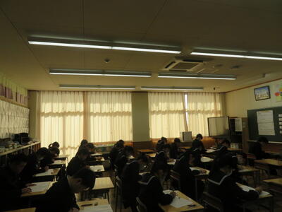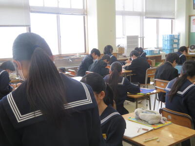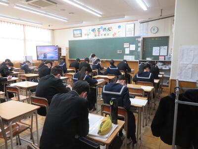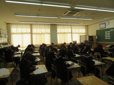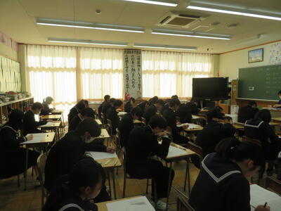 受験に向けて、まとめのプリントに取り組んでいました。先週行われた到達度確認テストのような集中力で、ひとりひとりが一生懸命プリントの問題を解いていました。受験までもう少しです。集中力を切らさず、頑張り続ける3年生、集団としてとってもいいですね。