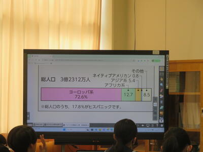 「北アメリカ州の民族・文化にはどのような特徴があるか」という課題について学習をしていました。取材した時は、先生が「では、まず顔をあげてください」と一声かけると、すぐ切り替えて、全員が先生の方を見ている姿が印象的でした。先生から「アメリカは、どんなイメージですか?」と尋ねられると、生徒達は次々と思いついたことを発言していました。イメージだけでも人種や文化が多様であることがわかりました。これから国の成り立ちや特徴について学習していくようです。