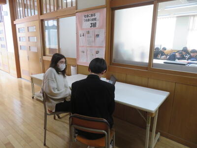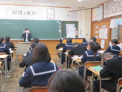 3年生は、1限から5限まで「到達度確認テスト」が行われていました。受験当日に向けて、今まで勉強してきた成果を試すテストです。受験当日のような雰囲気で、どのクラスも頑張っていました。テストが終わってからが一番大事です。間違った問題を解き直したり、問題の傾向を考えたり復習することでさらにパワーアップできるゴールデンタイムです。もうひとふんばり!がんばれ雄山中3年生!