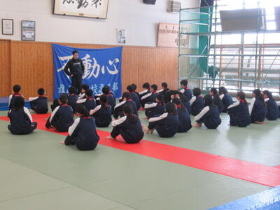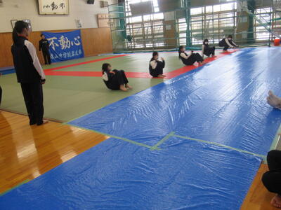 柔道場で前転と後転の練習に取り組んでいました。