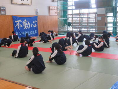 練習の合間に、柔軟運動に取り組んで、後転の途中の動作(姿勢)のポイントを確認しました。