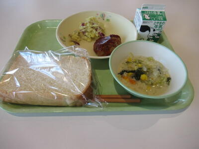 本日のメニューは、 食パン、牛乳、ハンバーグのケチャップソースかけ、チーズおさつ、豆乳スープ です。