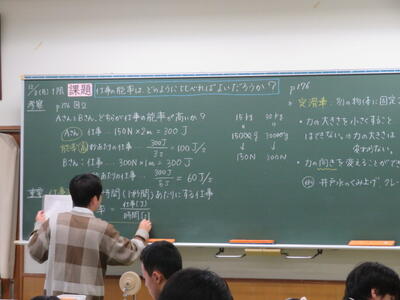先生の説明の中でW(ワット)という単位が出てきました。W(ワット)は2年時の「電気」の分野でも学習したそうです。どのような関係があるのでしょうか。先生は、2年時の復習も含めて、丁寧に説明をしていました。